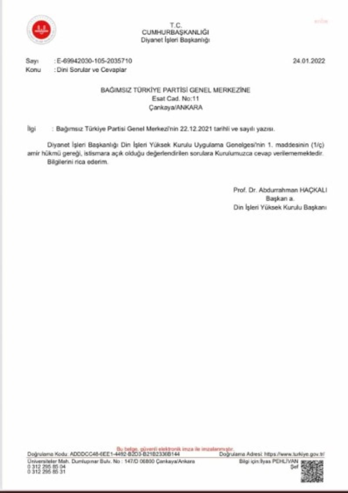 Diyanet, BTP’ye 32 gün sonra yanıt verdi. Din İşleri Yüksek Kurulu Başkanı Prof. Dr. Abdurrahman Haçkalı imzalı yanıtta, “Diyanet İşleri Başkanlığı Din İşleri Yüksek Kurulu Uygulama Genelgesi'nin 1. maddesinin (1/ç) amir hükmü gereği, istismara açık olduğu değerlendirilen sorulara cevap verilememektedir” denildi.