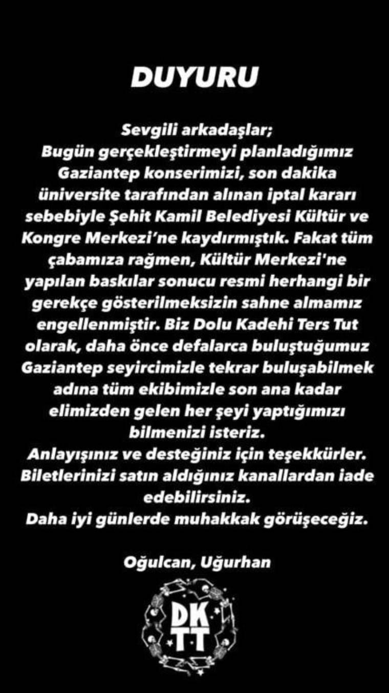 "Sevgili arkadaşlar; Bugün gerçekleştirmeyi planladığımız Gaziantep konserimizi, son dakika üniversite tarafından alınan iptal kararı sebebiyle Şehit Kamil Belediyesi Kültür ve Kongre Merkezi'ne kaydırmıştık. Fakat tüm çabamıza rağmen, Kültür Merkezi'ne yapılan baskılar sonucu resmi herhangi bir gerekçe gösterilmeksizin sahne almamız engellenmiştir. Biz Dolu Kadehi Ters Tut olarak, daha önce defalarca buluştuğumuz Gaziantep seyircimizle tekrar buluşabilmek adına tüm ekibimizle son ana kadar elimizden gelen her şeyi yaptığımızı bilmenizi isteriz. Anlayışınız ve desteğiniz için teşekkürler. Biletlerinizi satın aldığınız kanallardan iade edebilirsiniz. Daha iyi günlerde muhakkak görüşeceğiz."