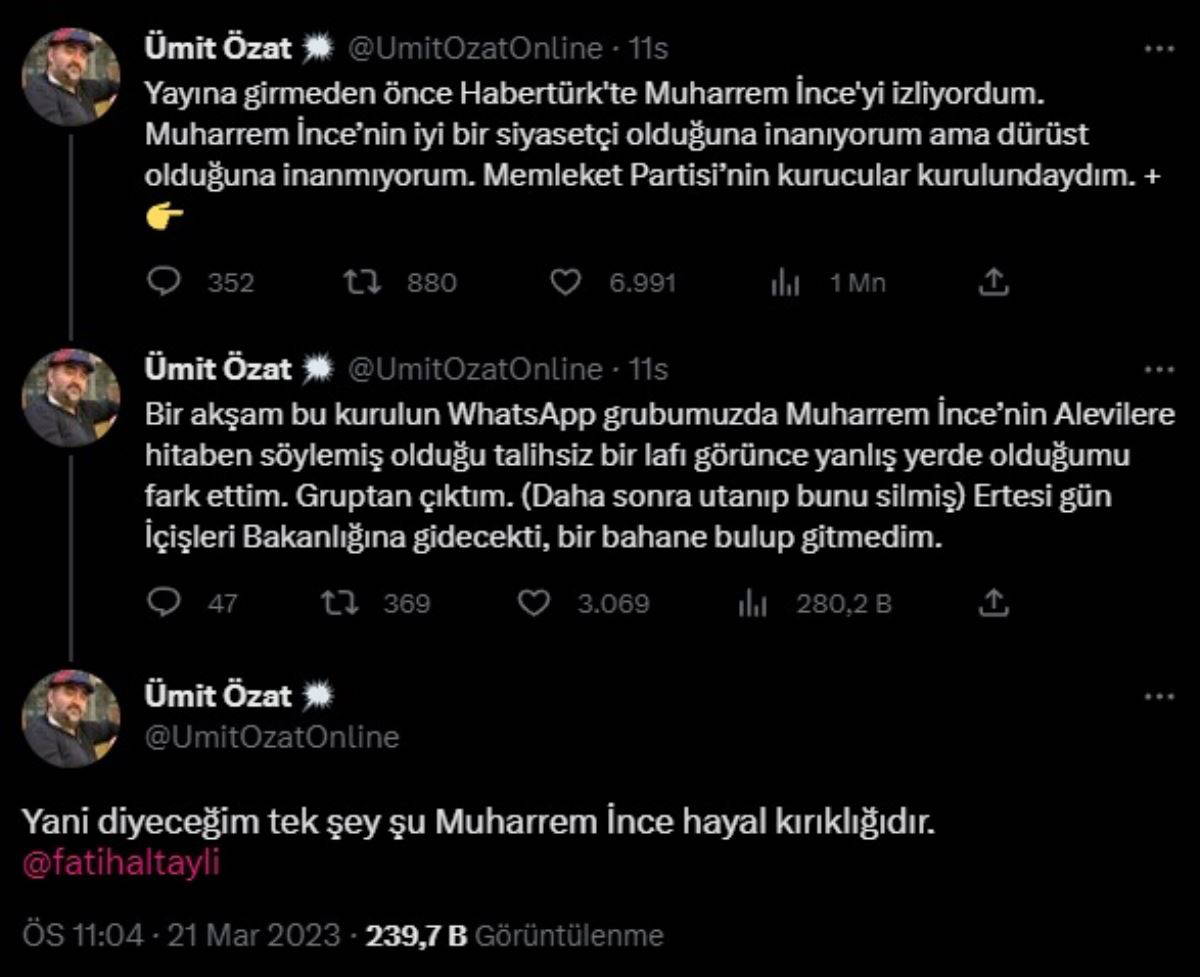 Özat, Fatih Altaylı'yı etiketlediği paylaşımında "WhatsApp grubumuzda Muharrem İnce’nin Alevilere hitaben söylemiş olduğu talihsiz bir lafı görünce yanlış yerde olduğumu fark ettim" ifadelerini kullandı.