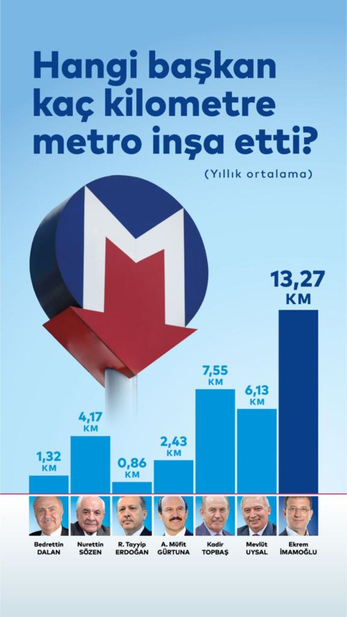 Ekrem İmamoğlu ise görev yapmaya başladığı 2019 yılından bugüne kadar 46.20 kilometre raylı sistemi hizmete soktu. Ayrıca dönemin İBB başkanları Bedrettin Dalan’ın 1984-1989 yılları arasında 6.6 kilometre, Nurettin Sözen’in 1989-1994 yılları arasında 20.85 kilometre, Ali Müfit Gürtuna’nın 1998-2004 yılları arasında 13.1 kilometre, Kadir Topbaş’ın 2004-2017 yılları arasında 101.85 kilometre, Mevlüt Uysal’ın 2017-2019 yılları arasında 9.50 kilometre raylı sistemler yaptığı kaydedildi.