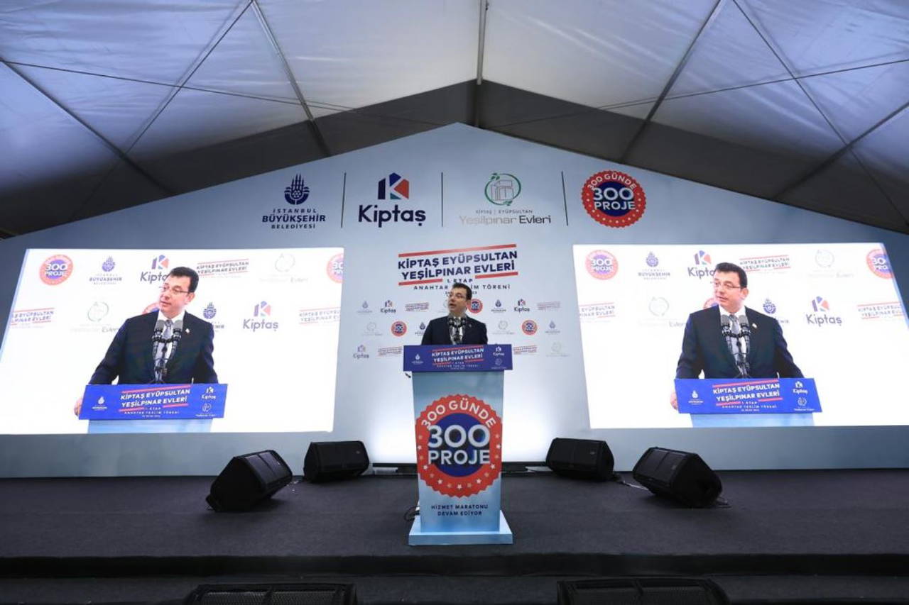 Kendilerinden önceki KİPTAŞ yönetiminin çalışma alanlarını değiştirdiğini kaydeden İmamoğlu, “İnsanlara sosyal konut üretmek yerine, insanlarımızın kentsel dönüşümle beraber oturulmaması gereken evlerini dönüştürmek yerine, İstanbul'da lüks konut üretmeyi ne yazık ki kendilerine felsefe edinmişlerdi. Benzer bir şeyi bugün TOKİ eliyle de yapıyorlar büyük oranda. Aslında baktığımızda, bu tür kamu kuruluşları rant peşinde koşan değil, müteahhit gibi davranan değil, insanların ihtiyaçları için güvence olan, güven sunan, imkanlarını seferber ederek insanlarına layık evler üreten bir kurum olmalıydı. İşte bizim tam da bu anlayışla, sözleşme süresinden 5 ay önce, 6 ay önce, hatta 1 yıl önce teslim ettiğimiz konutlarımız var” dedi. Günümüzde, konutların erken ya da geç tesliminin vatandaşların ekonomisine olumlu veya olumsuz etkilerinin olduğuna dikkat çeken İmamoğlu, “Bu felsefeyi değiştirmek, bizim için kıymetli. Bugün sabit taksitle insanları ev sahibi yapmanın da gururunu yaşıyoruz” diye konuştu.