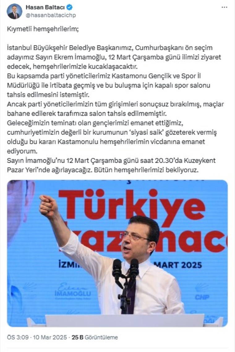 Kastamonu Belediye Başkanı Hasan Baltacı'nın aktardığına göre CHP'den parti yöneticileri, İmamoğlu'nun Kastamonu programı için Kastamonu Gençlik ve Spor İl Müdürlüğü ile irtibata geçerek kapalı spor salonu tahsisi talep etti. Ancak talebe olumlu yanıt verilmedi.