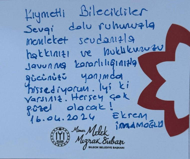 Silivri'de tutuklu bulunan İstanbul Büyükşehir Belediye (İBB) Başkanı ve CHP'nin cumhurbaşkanı adayı Ekrem İmamoğlu, Bilecik Belediye Başkanı Melek Mızrak Subaşı aracılığıyla Bileciklilere el yazısıyla mesaj gönderdi.
