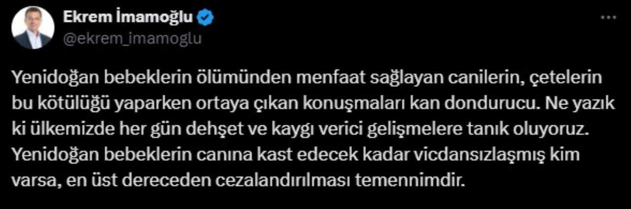 X hesabından bir paylaşım yapan İmamoğlu, "Yenidoğan bebeklerin ölümünden menfaat sağlayan canilerin, çetelerin bu kötülüğü yaparken ortaya çıkan konuşmaları kan dondurucu. Ne yazık ki ülkemizde her gün dehşet ve kaygı verici gelişmelere tanık oluyoruz. Yenidoğan bebeklerin canına kast edecek kadar vicdansızlaşmış kim varsa, en üst dereceden cezalandırılması temennimdir" dedi.