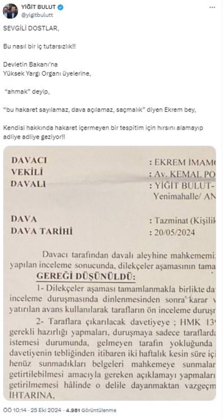 Başdanışman Bulut, dava dilekçesini X hesabından paylaşıp ‘hakaret değil bir tespit yaptığını’ öne sürdü. Bulut paylaşımında “Bu nasıl bir iç tutarsızlık! Devletin bakanına, yüksek yargı organı üyelerine ‘Ahmak’ deyip ‘Bu hakaret sayılamaz, dava açılamaz, saçmalık’ diyen Ekrem Bey kendisi hakkında hakaret içermeyen bir tespitim için hırsını alamayıp adliye adliye geziyor” dedi.
