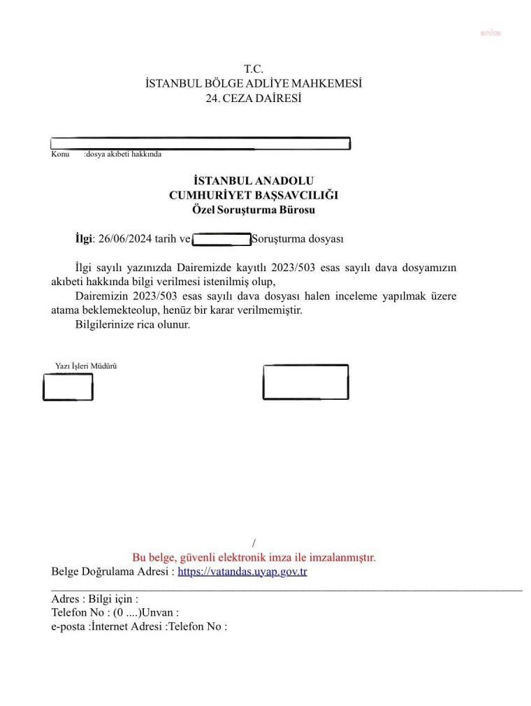 Polat, konuyla ilgili bir yargı belgesini de paylaştı. Başvuru üzerine İstanbul Bölge Adliye Mahkemesi 24. Ceza Dairesi tarafından yazıldığı anlaşılan belgede, "Dairemizin 2023/503 esas sayılı dava dosyası halen inceleme yapılmak üzere atama beklemekte olup, henüz bir karar verilmemiştir" ifadesi yer aldı.