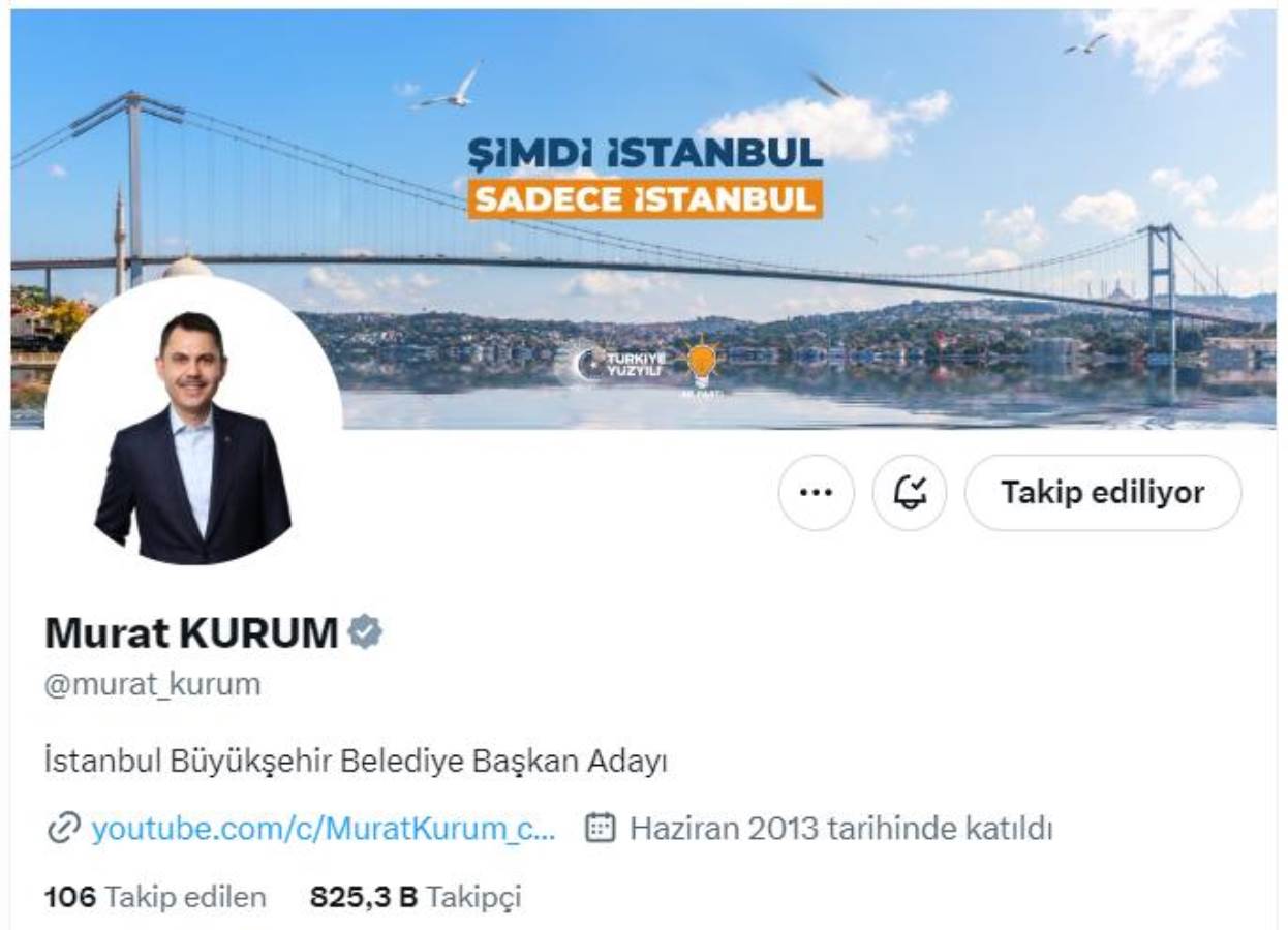 Profilinin kapak fotoğrafında "Şimdi İstanbul Sadece İstanbul" yazılı bir görsel ekleyen Kurum, profil biyografisine 'İstanbul Büyükşehir Belediye Başkan Adayı' yazdı.