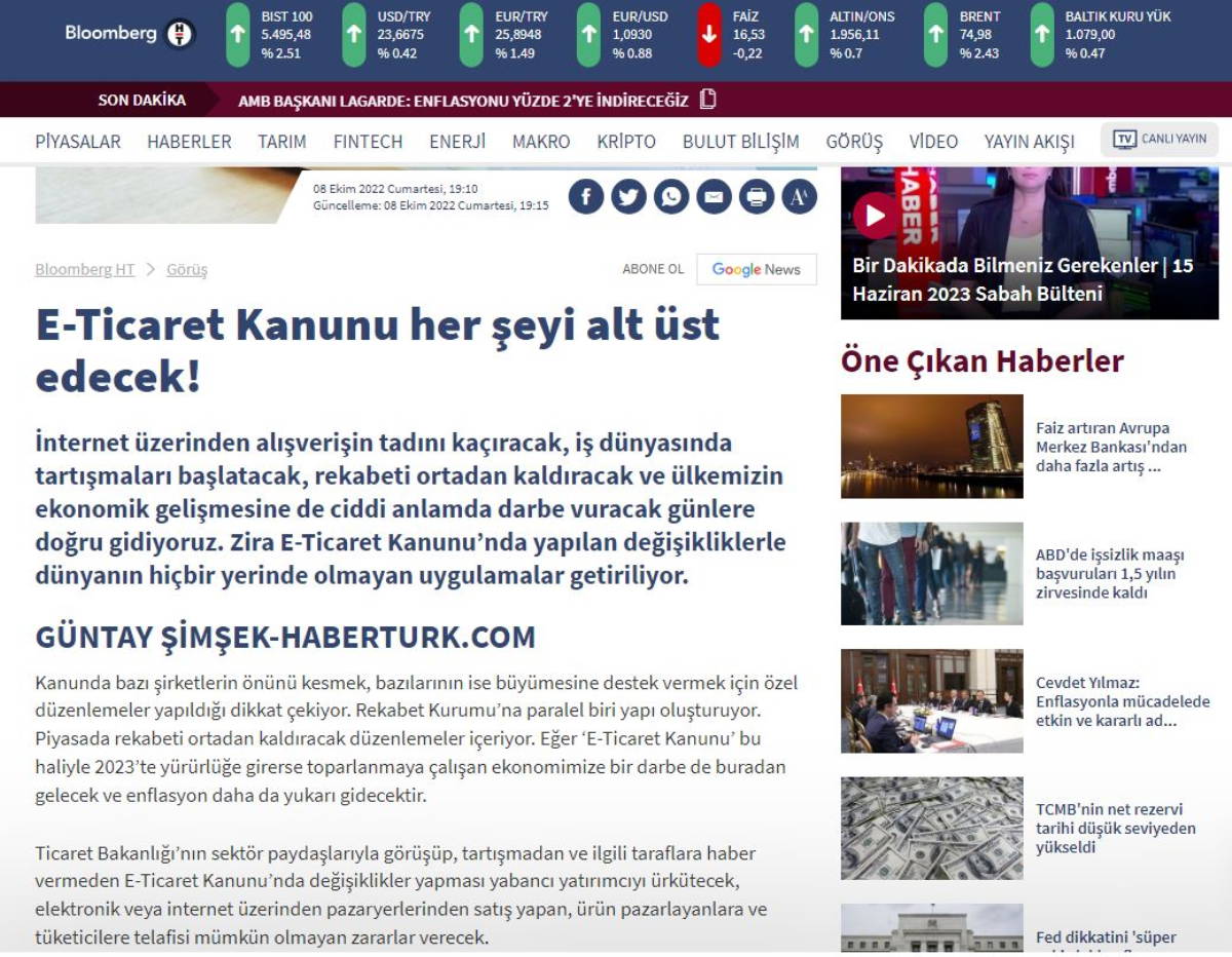 Bloomberg’de 8 Ekim 2022’deki Güntay Şimşek imzalı yazıda, “E-Ticaret Kanunu her şeyi altüst edecek” deniyor ve “e-Ticaret Kanunu’nda yapılan değişikliklerle dünyanın hiçbir yerinde olmayan uygulamalar getiriliyor” yorumu yapılıyor.
