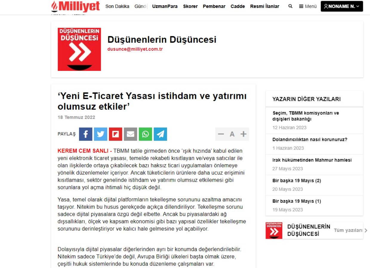 Milliyet, 18 Temmuz 2022 tarihli haberinde yeni e-ticaret yasasının istihdam ve yatırımı olumsuz etkilediği vurgulanıyor.