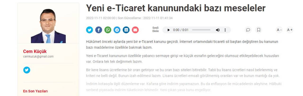 “Kendi markasını satamayacak” başlıklı haberde de Bilgi Üniversitesi Hukuk Fakültesi Öğretim Üyesi Prof. Dr. Kerem Cem Şanlı’nın görüşlerine yer veriliyor. Şanlı, yasa ile ilgili e-ticaret platformunun kendi markasını satamayacağını belirtiyor.