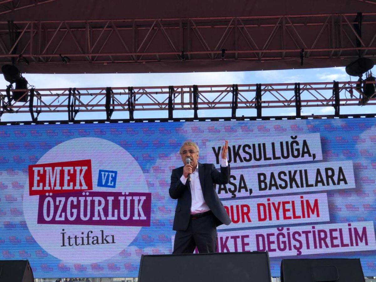 Burada sadece İstanbul'dan, Türkiye'den yurttaşlarımız yok. Burada Gezi'den, Kobani davasına kadar tutuklu eş başkanlardan, milletvekillerine, belediye başkanlarına kadar tutsak arkadaşlarımız da var. Bu mitingde el eleyiz, kol kolayız. Bu da böyle bilinsin. Şimdi bize soruyorlar ‘Seçimlerde ne yapacaksınız?’ Biz 5 Ocak'ta, Emek ve Özgürlük İttifakı partileri olarak bir bildiri yayınladık. Orada şunu dedik, ‘Birinci olarak en geniş toplumsal mutabakatın sağlanacağı ortak bir adayın ortaya çıkması için işe başlıyoruz. Buna var mısınız?’ dedik. İkinci olarak, bak kardeşim. Bu sese kulak vermiyorsan, ısrarla bu sese kulak kapatıyorsan, bak sana söylüyorum. Bu ülkede işçilerin oyları, yoksul emekçilerin oyları, gençlerin, kadınların oyları, Kürt halkının oyları, eşit yurttaşlık isteyen Alevilerin oyları çantada keklik değil kardeşim. Bunu da bileceksin. Eğer inkârcı, yok sayıcı tutumunu devam ettirirsen Emek ve Özgürlük İttifakı kendi adayını da çıkaracak. Halkla birlikte bu meydanlarda çıkaracak.”