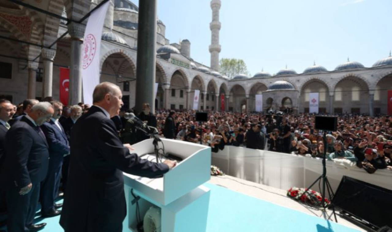 AKP'li Cumhurbaşkanı Recep Tayyip Erdoğan, dün restorasyonu tamamlanan Sultanahmet Camisi'nin açılışında konuştu. Erdoğan cami avlusunu miting alanına çevirdi.