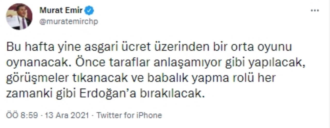 CHP Ankara Milletvekili Murat Emir, 2022 yılı için belirlenecek asgari ücret görüşmelerine ilişkin AKP'li Cumhurbaşkanı Recep Tayyip Erdoğan'ın oynayacağı role dikkat çekti.