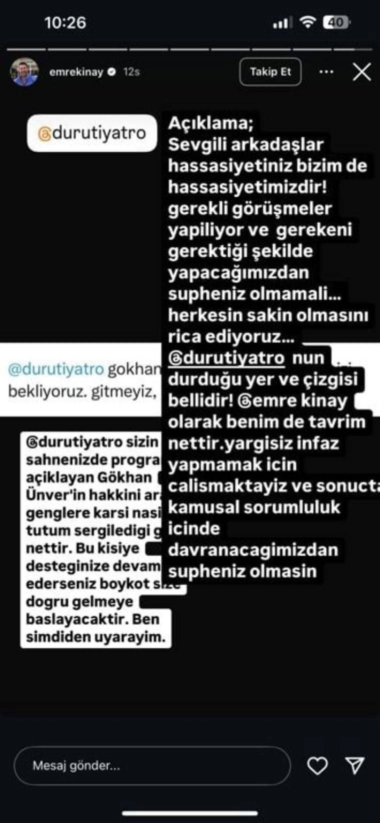 Kınay, komedyen Gökhan Ünver'in 10 ve 29 Nisan'da Duru Tiyatro'da alacağı sahne gösterilerinin iptal edilmesi çağrılarına ilişkin, "Duru Tiyatro'nun durduğu yer ve çizgisi bellidir. Benim de tavrım nettir. Yargısız infaz yapmamak için çalışmaktayız ve sonuçta kamusal sorumluluk içinde davranacağımızdan şüpheniz olmasın" ifadelerini kullandı.