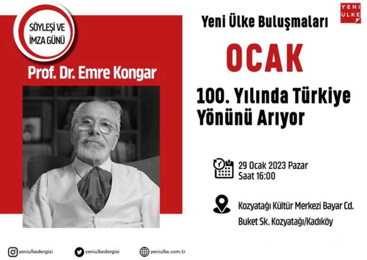 Aylık fikir dergisi Yeni Ülke’nin düzenlediği "Yeni Ülke Buluşmaları" devam ediyor. Yeni Ülke Buluşmaları’nın Ocak ayı konuğu Cumhuriyet Gazetesi yazarlarından Prof. Dr. Emre Kongar olacak.