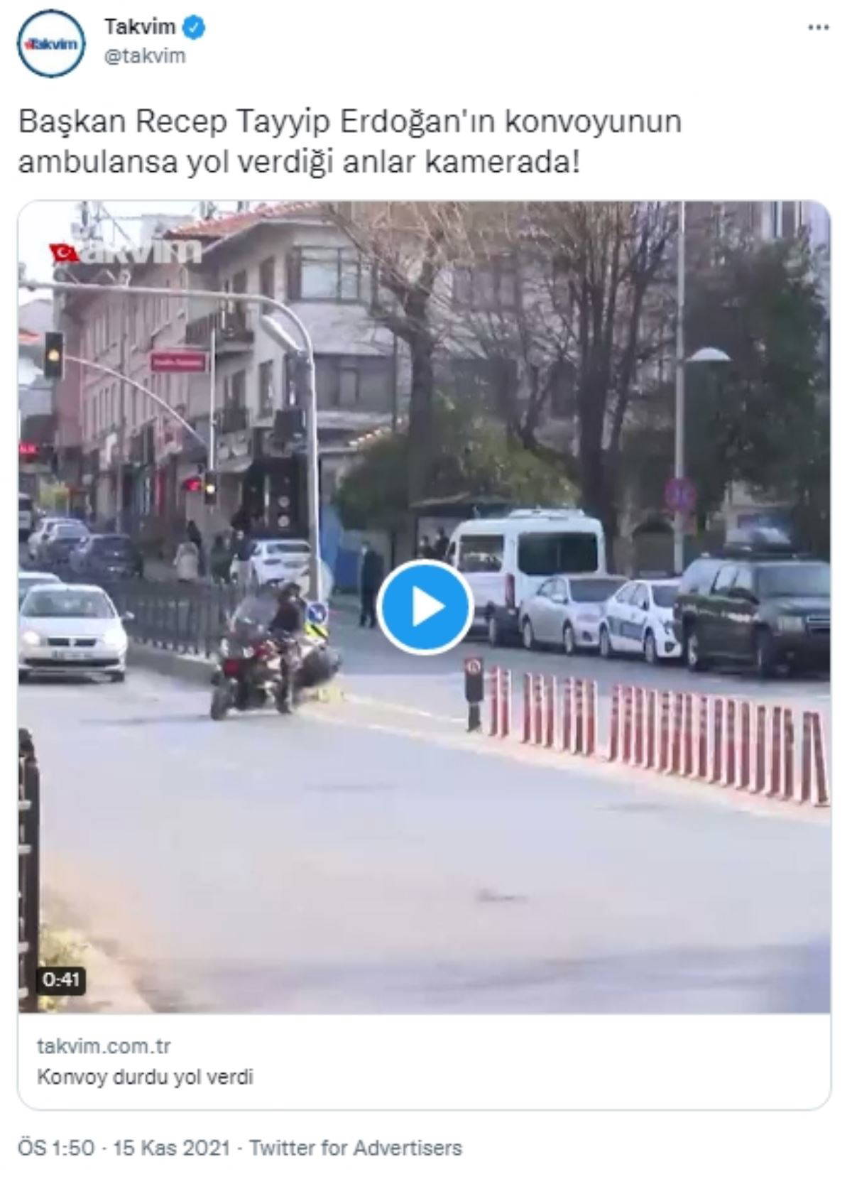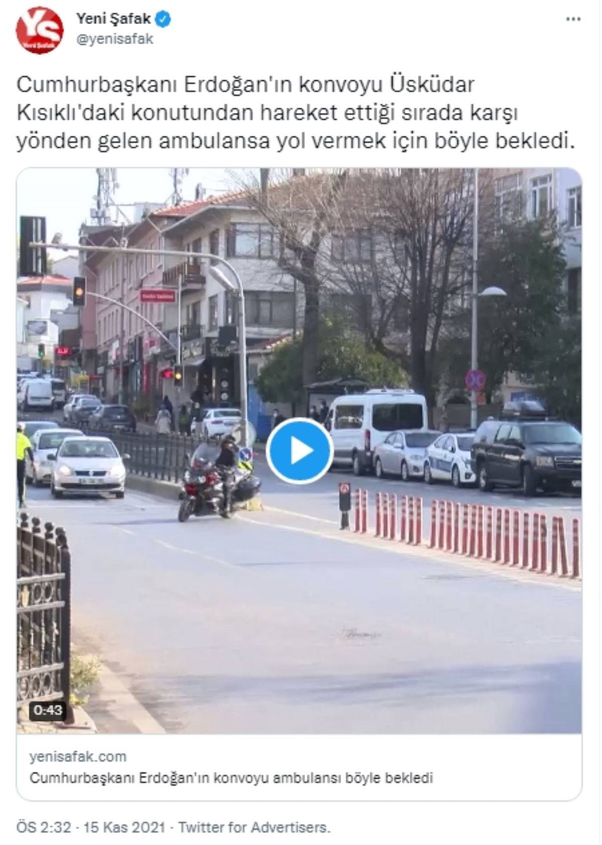 AKP'li Cumhurbaşkanı Recep Tayyip Erdoğan'ın konvoyunun Üsküdar'da ambulansın geçişini beklemesi iktidara yakın medya tarafından "haber" olarak yayınlandı.