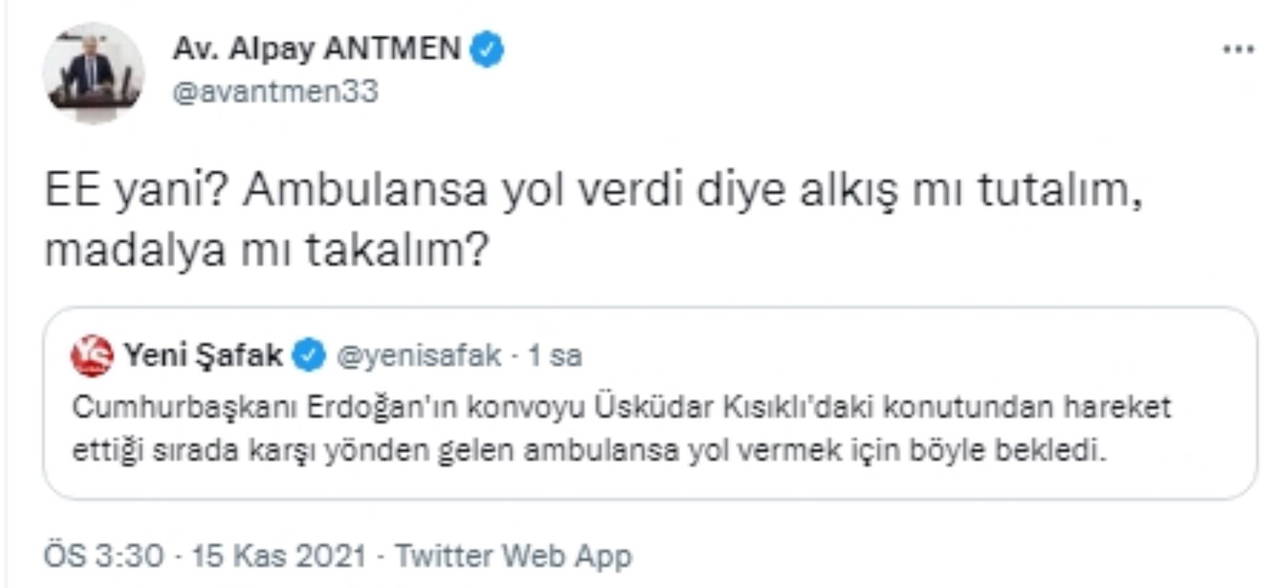 CHP Mersin Milletvekili Alpay Antmen, görüntüleri haberleştiren Yeni Şafak'ın ilgili haberini Twitter hesabı üzerinden alıntıladığı paylaşımında "Ee yani? Ambulansa yol verdi diye alkış mı tutalım, madalya mı takalım?" ifadelerini kullandı.