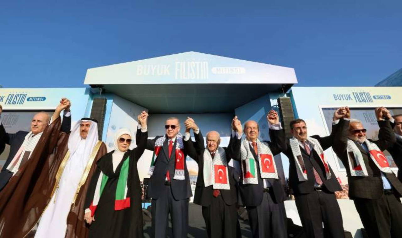 AKP, Cumhuriyet’in 100. yılı olan 29 Ekim’den bir gün önce Atatürk Havalimanı’nda “Büyük Filistin Mitingi” düzenledi. Cumhur İttifakı ortaklarından Yeniden Refah Partisi lideri Fatih Erbakan mitinge katılmadı. Medyascope’ta yer alan habere göre Erbakan’a yakın kaynaklar, Erbakan’ın mitinge katılmama kararı aldığını ve herhangi bir gerekçe göstermediğini söyledi.