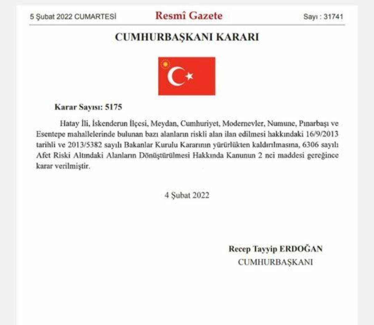 Hatay’da depremden etkilenen İskenderun’a bağlı Meydan, Cumhuriyet, Numune, Esentepe, Pınarbaşı ve Modernevler mahallelerinde bazı bölgeler 2013’te Bakanlar Kurulu kararıyla afet riski altındaki bölgeler kapsamına alındı. Bu tarihten sonra mahallelerde yapılan kentsel dönüşüm çalışmaları, 2015’te Çevre Bakanlığı’nın sitesinden “Sağlıksız ve güvensiz yapı stokunun yenilenerek can ve mal güvenliğini korumak amacıyla kentsel dönüşüm çalışmaları hızla devam etmektedir. Bu kapsamda; yaklaşık 78 hektarlık alan riskli alan olarak kararlaştırılmıştır. Alanda yapılması planlanan kentsel tasarım projelerinin görselleri tamamlanmıştır” ifadeleriyle duyuruldu.