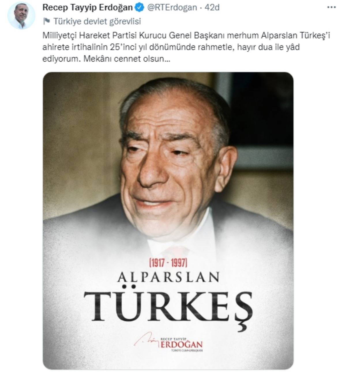 Erdoğan, Twitter hesabından yaptığı paylaşımda, "Milliyetçi Hareket Partisi Kurucu Genel Başkanı merhum Alparslan Türkeş'i ahirete irtihalinin 25'inci yıl dönümünde rahmetle, hayır dua ile yâd ediyorum. Mekânı cennet olsun..." ifadesini kullandı.