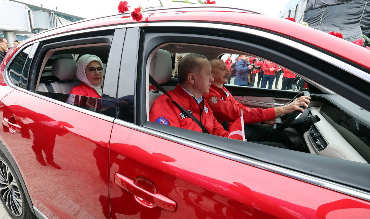 Erdoğan, Aliyev'in kullandığı TOGG T10X ile TEKNOFEST alanına geldi. İki lider ardından birlikte kürsüye çıkarak ziyaretçilere karanfil dağıttı.