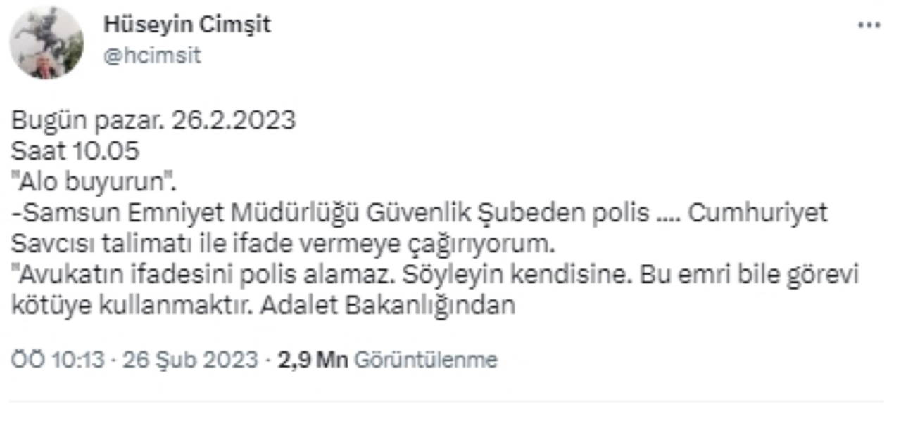 Avukat Cimşit, sosyal medya hesabından yaptığı açıklamada polisin kendisini arayarak ifade vermek üzere Samsun Cumhuriyet Başsavcılığı'na çağırdığını duyurdu.