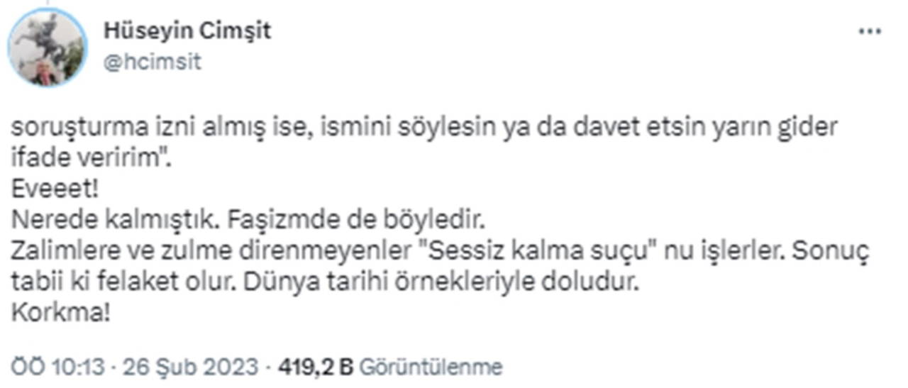 Kendisini ifadeye çağıran polisle arasında geçen diyalogu da sosyal medyadan paylaşan Cimşit, avukat olmasına rağmen ifadesinin polis tarafından alınmak istenmesine de tepki göstererek "Faşizmde de böyledir. Zalimlere ve zulme direnmeyenler 'Sessiz kalma suçu' nu işlerler. Sonuç tabii ki felaket olur. Dünya tarihi örnekleriyle doludur. Korkma!" dedi.