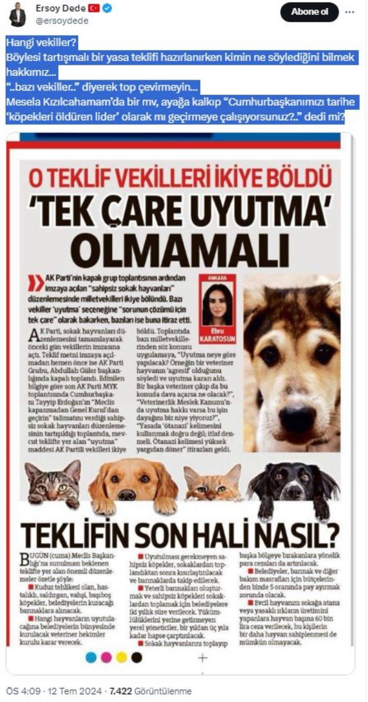 AKP Grup Başkanı Abdullah Güler'in, teklifin Meclis'e sunulduğunu duyurduğu basın açıklamasının ardından sosyal medya hesabından bir paylaşımda bulunan Dede, Hürriyet gazetesinin teklifle ilgili AKP içerisinde bölünmeye yol açtığına dair haberini alıntlayarak şöyle yazdı: