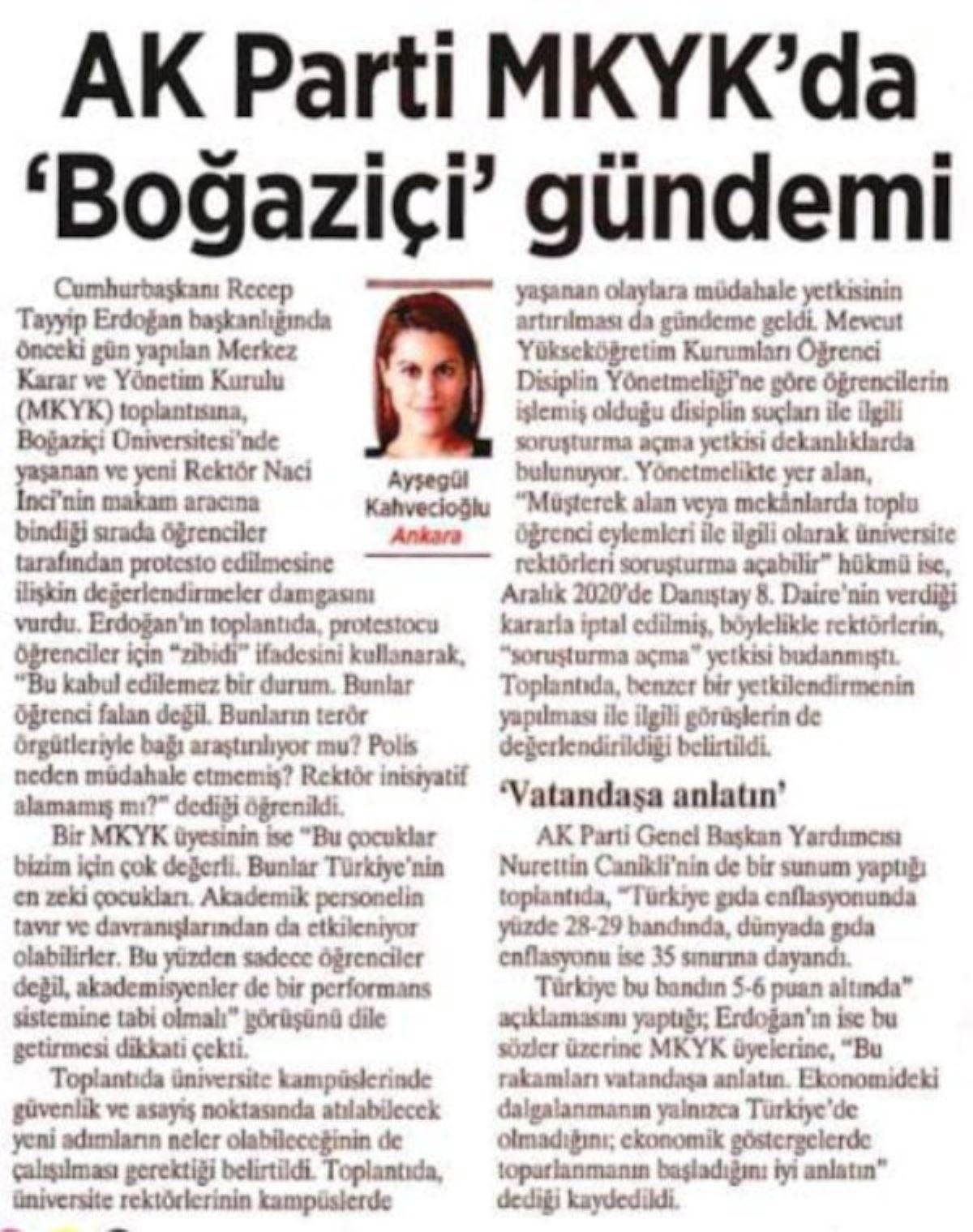 Öte yandan, Milliyet Gazetesi'nde bugün yayınlanan, "AK Parti MKYK’da ‘Boğaziçi’ gündemi" başlıklı kulis haberde dikkat çeken satırlar yer aldı.