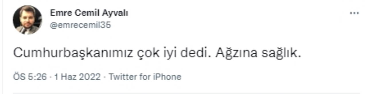 Bunlardan biri de AKP MKYK Üyesi Emre Cemil Ayvalı oldu. Ayvalı, konunun gündem olması üzerine Erdoğan'ın skandal sözlerine gönderme yaparak "Cumhurbaşkanımız çok iyi dedi. Ağzına sağlık." ifadelerini kullandı.