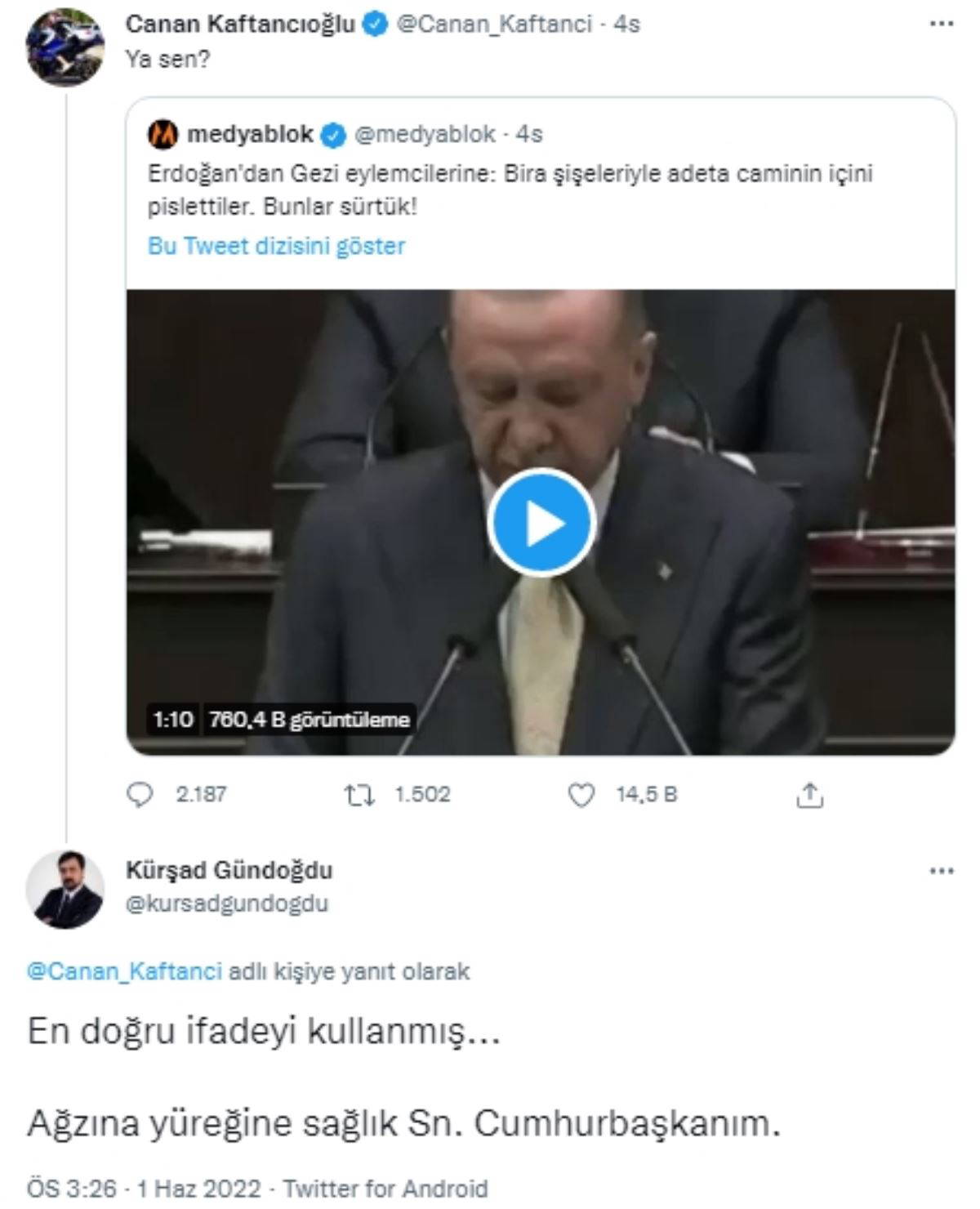 AKP Samsun İl Tanıtım ve Medya Başkan Yardımcısı| Kürşat Gündoğdu da yine Kaftancıoğlu'nun Erdoğan'a verdiği "Ya sen?" şeklindeki yanıta cevaben "En doğru ifadeyi kullanmış... Ağzına yüreğine sağlık Sn. Cumhurbaşkanım" dedi.