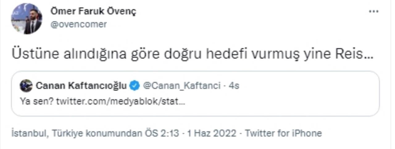 AKP İstanbul İl Başkanlığı Dijital Medya Koordinatörü Ömer Faruk Övenç, CHP İstanbul İl Başkanı Canan Kaftancıoğlu'nun Erdoğan'ın hakaretine verdiği yanıtı Twitter hesabından alıntılayarak "Üstüne alındığına göre doğru hedefi vurmuş yine Reis..." diye yazdı.