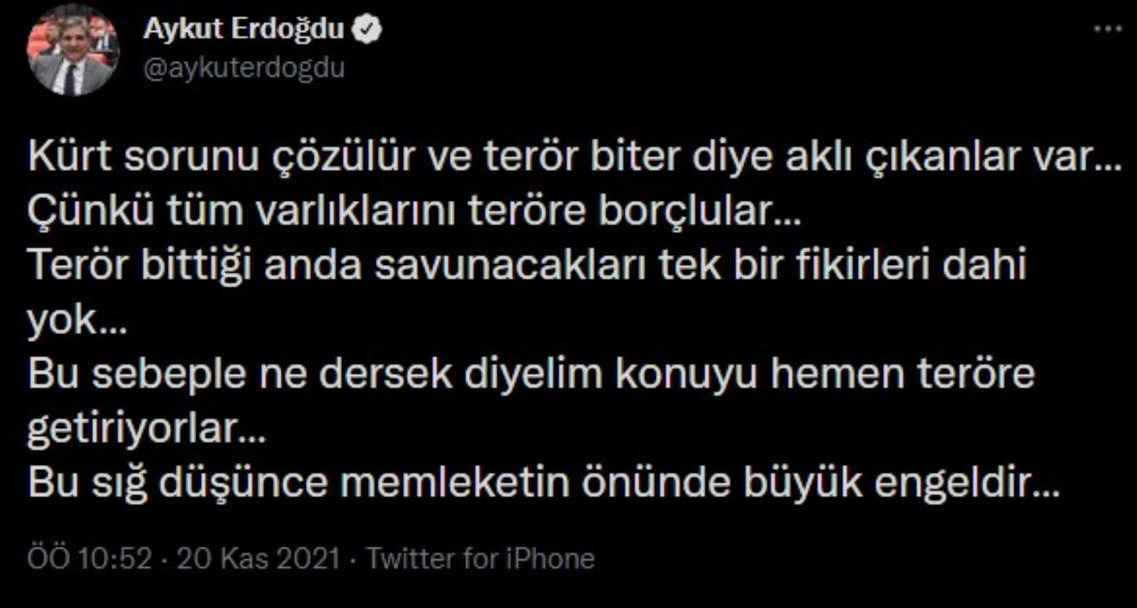 Erdoğdu, ''Ne dersek diyelim konuyu hemen teröre getiriyorlar. Bu sığ düşünce memleketin önünde büyük engeldir'' ifadelerini kullandı.