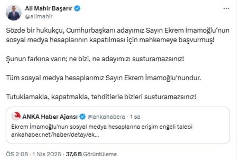 İstanbul Büyükşehir Belediye Başkanı ve CHP'nin tutuklu Cumhurbaşkanı adayı Ekrem İmamoğlu'nun sosyal medya hesaplarına erişim engeli getirilmesi talebine CHP Grup Başkanvekili Ali Mahir Başarır'dan bir tepki geldi.
