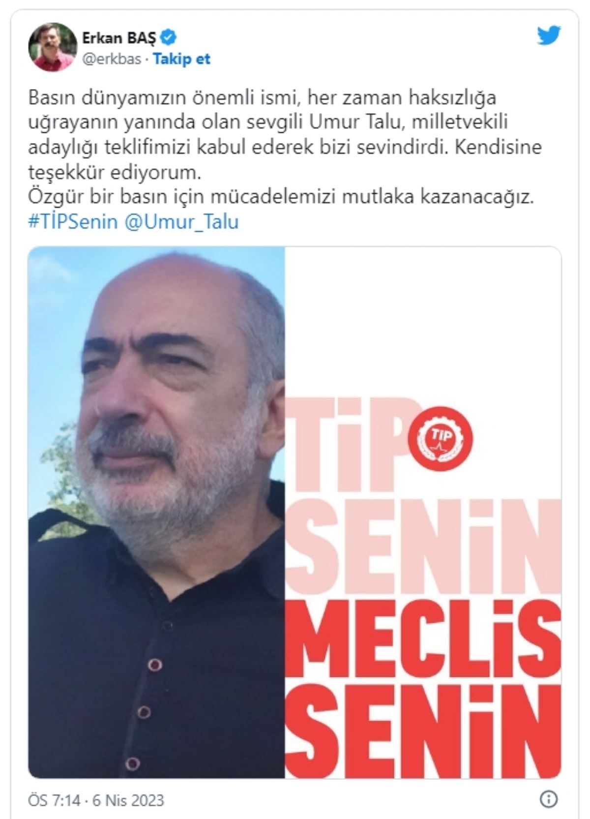 TİP Başkanı Erkan Baş, sosyal medya hesabından Umur Talu'nun adaylığını şu sözlerle duyurdu: