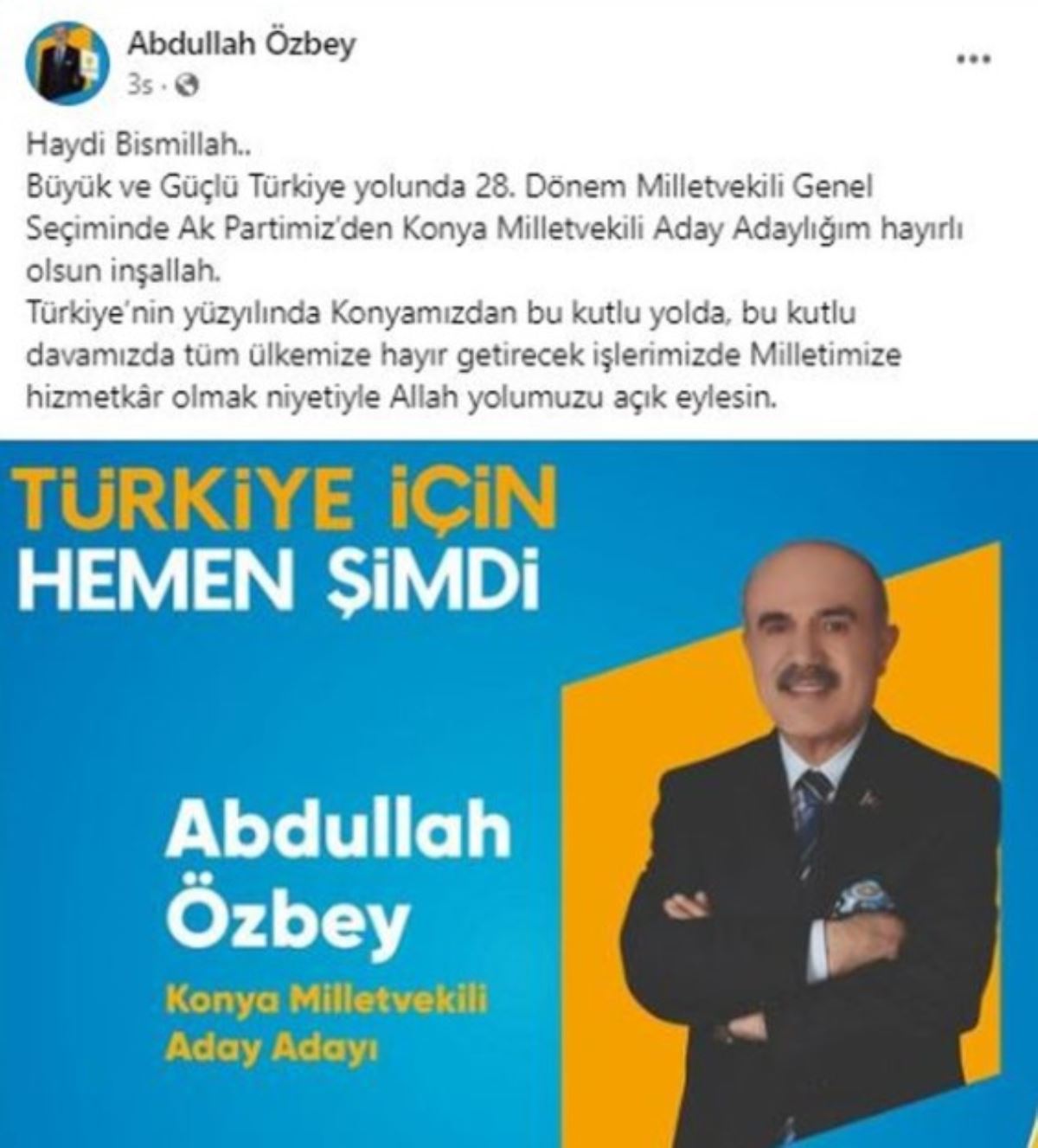 5 yıl tutuklu kalan ve sonrasında tahliye edilen Özbey, sosyal medya hesabından yaptığı açıklamada AKP'den Konya Milletvekili aday adayı olduğunu duyurdu.