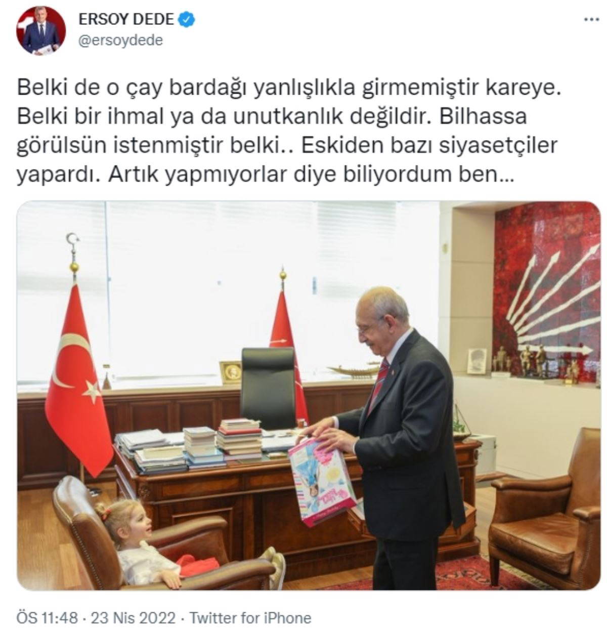 Dede, Twitter hesabı üzerinden ilgili fotoğrafı paylaşıp "Belki de o çay bardağı yanlışlıkla girmemiştir kareye. Belki bir ihmal ya da unutkanlık değildir. Bilhassa görülsün istenmiştir belki.. Eskiden bazı siyasetçiler yapardı. Artık yapmıyorlar diye biliyordum ben…" diye yazdı.