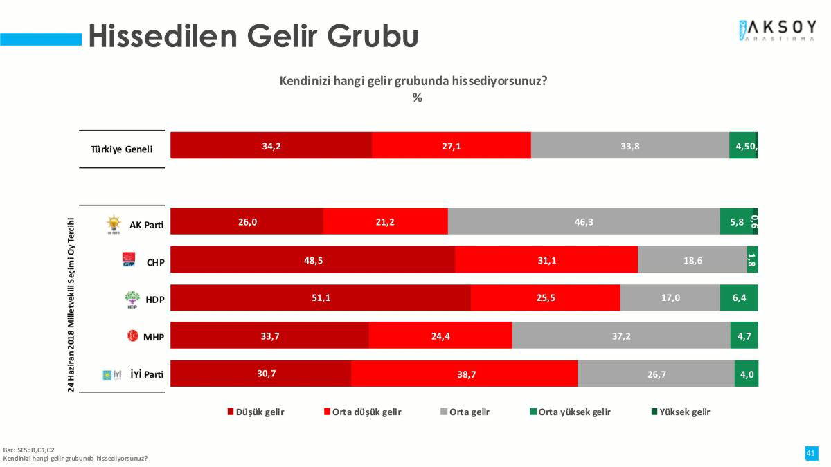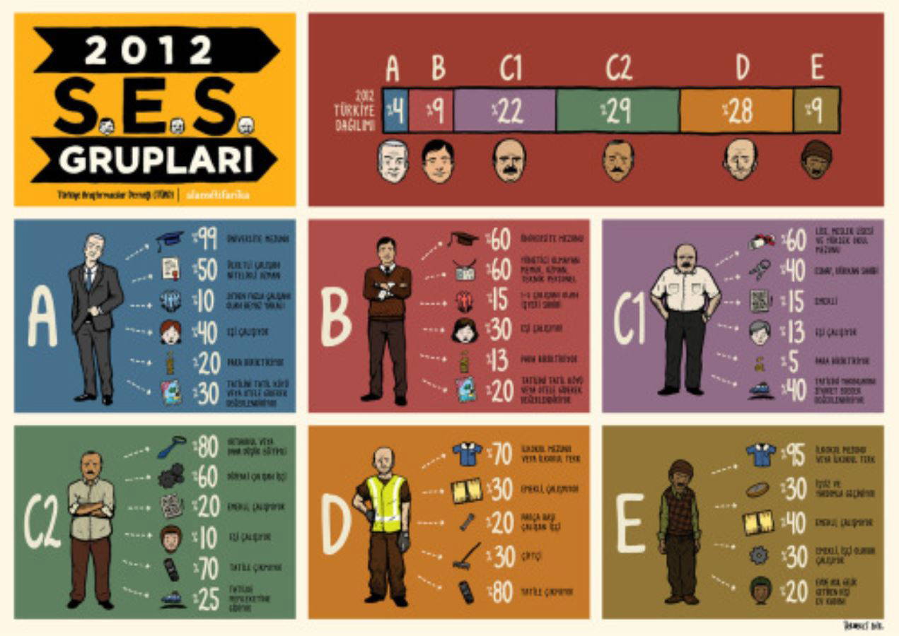 Bu tabloya göre Türkiye’de yaşayan yurttaşların toplamda yüzde 37’si alt sosyo-ekonomik statü (D-E) grubunda, yüzde 51’i orta sosyo-ekonomik statü grubunda (C1-C2) ve yüzde 13’ü orta üstü-üst sosyo-ekonomik statü grubundaydı.