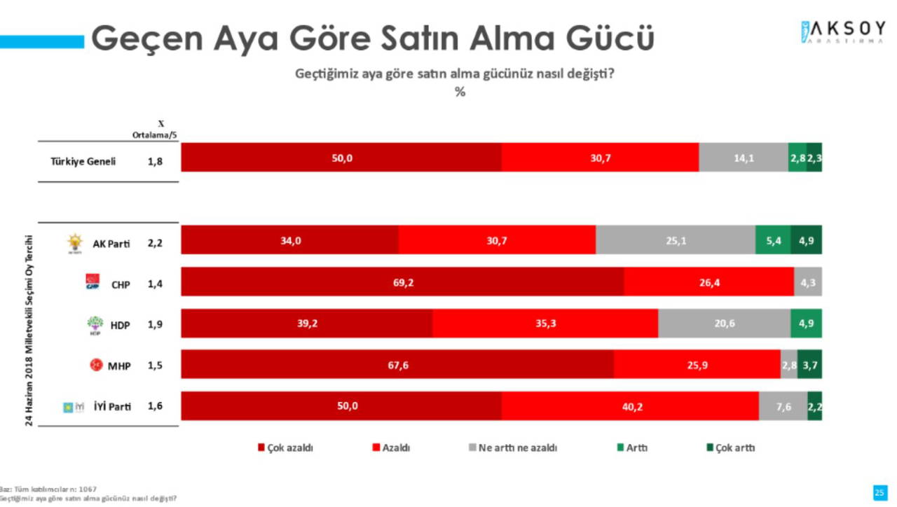 Toplumun yarısı satın alma gücünün çok azaldığını ifade ederken, toplamda azaldı diyenlerin oranı %80,7. Özellikle MHP seçmeninin yanıtlarına dikkatinizi çekmek isterim. MHP seçmeninde bu oran %93,6. Görüldüğü üzere MHP tabanı, MHP üst yönetimi gibi ülkeyi güllük gülistanlık görmüyor.