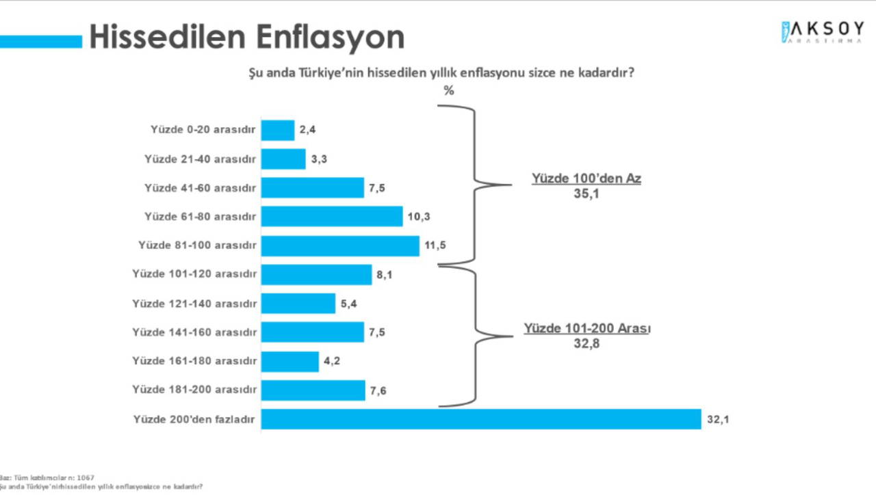 Her ne kadar iktidar bloğu “ülkede ufak tefek sorunlar olduğunu ve bu ufak sorunların da dış mihraklardan kaynaklandığını” iddia etse de, toplum meseleye çok farklı bakmaktadır. Örneğin; hissedilen enflasyon oranını sorduğumuzda aldığımız yanıtlardan, sorunun üç beş zincir marketin fırsatçılığı ile izah edilemez bir seviyede olduğu anlaşılmaktadır.