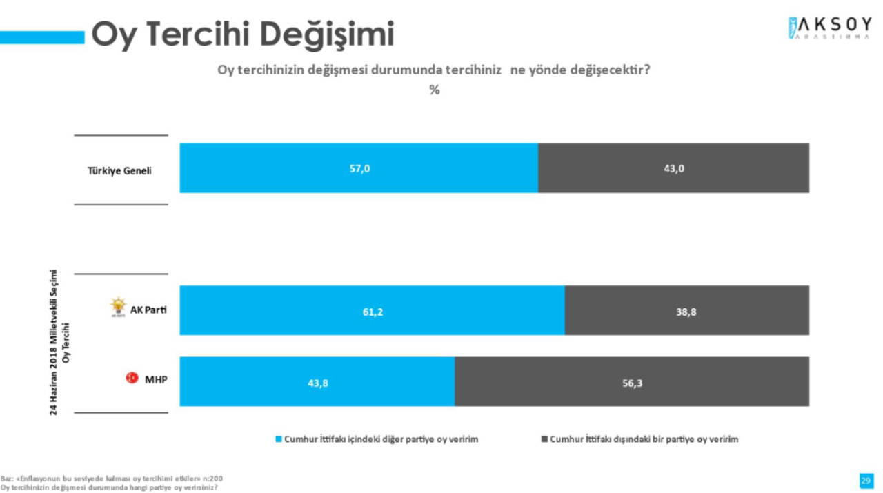 Cumhur İttifakı partilerine oy vermeyi düşünen seçmenin, enflasyonun seçime kadar bu düzeyde devam etmesi halinde %43’ünün ittifakın dışındaki bir partiye oy vereceğini belirttiğini görüyoruz.