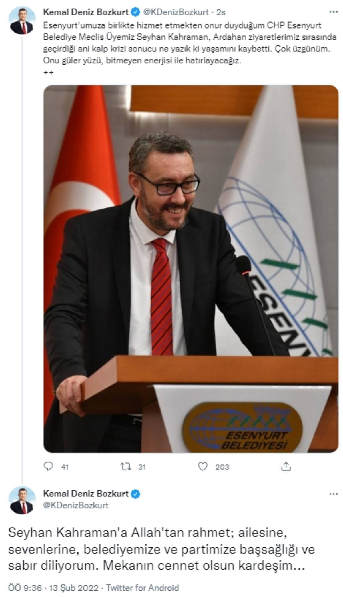 Acı haberi Esenyurt Belediye Başkanı Kemal Deniz Bozkurt da sosyal medya hesabından yaptığı paylaşımla duyurdu. Bozkurt, “Esenyurt'umuza hizmet etmekten onur duyduğum CHP Esenyurt Belediye Meclis üyemiz Seyhan Kahraman, Ardahan ziyaretlerimiz sırasında geçirdiği ani kalp krizi sonucu ne yazık ki yaşamını kaybetti. Çok üzgünüm. Onu güler yüzü, bitmeyen enerjisi ile hatırlayacağız” dedi.
