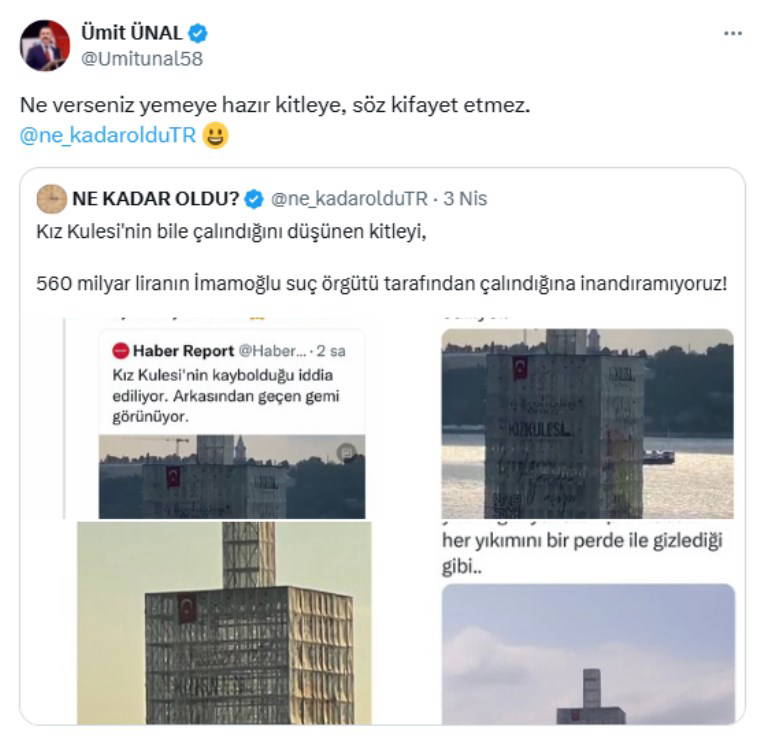 "NE KADAR OLDU?" adlı bir hesap, gazeteci Sedef Kabaş'ın da aralarında bulunduğu bazı sosyal medya hesaplarının Kız Kulesi'nde 2021 ve 2023 yılları arasında süren restorasyon çalışmaları esnasında Kız Kulesi'nden uzun bir süre görüntülenemesi üzerine paylaştıkları sosyal medya mesajlarını alıntılayarak "Kız Kulesi'nin bile çalındığını düşünen kitleyi, 560 milyar liranın İmamoğlu suç örgütü tarafından çalındığına inandıramıyoruz!" paylaşımında bulundu.