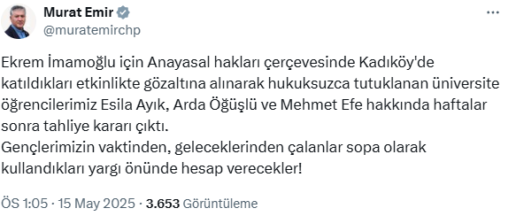 "Ekrem İmamoğlu için Anayasal hakları çerçevesinde Kadıköy'de katıldıkları etkinlikte gözaltına alınarak hukuksuzca tutuklanan üniversite öğrencilerimiz Esila Ayık, Arda Öğüşlü ve Mehmet Efe hakkında haftalar sonra tahliye kararı çıktı. Gençlerimizin vaktinden, geleceklerinden çalanlar, sopa olarak kullandıkları yargı önünde hesap verecekler."