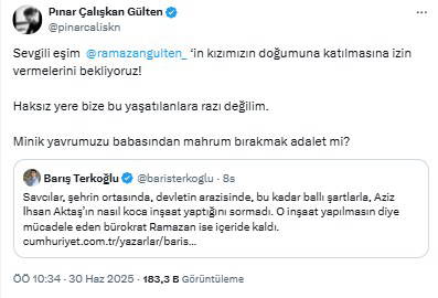Pınar Çalışkan Gülten, gazetemiz yazarı Barış Terkoğlu'nun bugün konuyla ilgili köşesinde kaleme aldığı yazıyı alıntıladığı paylaşımında, Ramazan Gülten’in yakında dünyaya gelecek kızlarının doğumuna katılmasına izin verilmesini isteyerek şu ifadeleri kullandı: