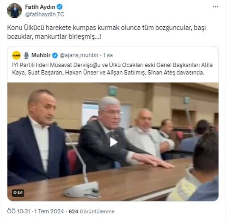 Ülkü Ocakları Genel Başkan Yardımcısı Fatih Aydın, sosyal medyadan dört ismin mahkeme salonundaki görüntüsü paylaşıp "Konu Ülkücü harekete kumpas kurmak olunca tüm bozguncular, başı bozuklar, mankurtlar birleşmiş…!" dedi.