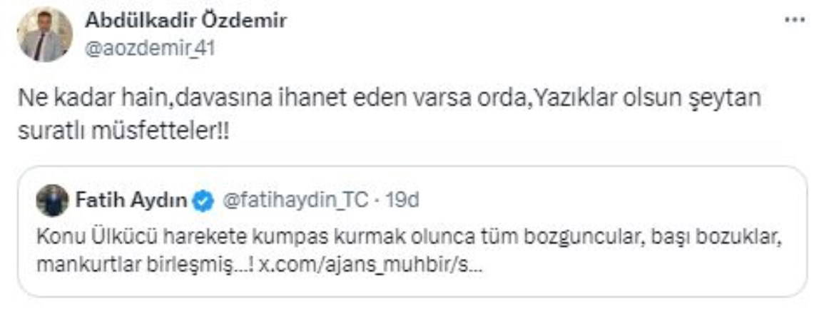 Ülkü Ocakları Kocaeli İl Başkanı Abdülkadir Özdemir de dört eski genel başkan için "Ne kadar hain, davasına ihanet eden varsa orda, yazıklar olsun şeytan suratlı müsfetteler!!" ifadelerini kullandı.