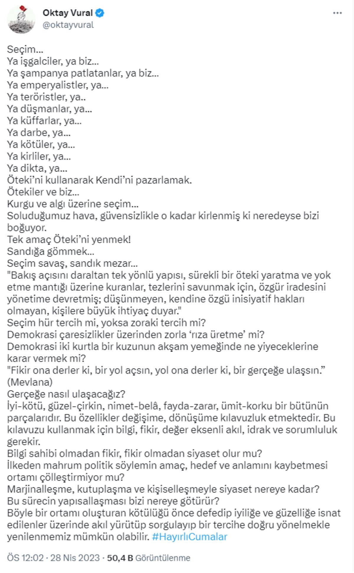 Sosyal medya hesabından açıklama yapan Vural, "Seçim... Ya işgalciler, ya biz… Ya şampanya patlatanlar, ya biz… Ya emperyalistler, ya… Ya teröristler, ya... Ya düşmanlar, ya... Ya küffarlar, ya… Ya darbe, ya... Ya kötüler, ya… Ya kirliler, ya… Ya dikta, ya... Öteki'ni kullanarak Kendi'ni pazarlamak. Ötekiler ve biz… Kurgu ve algı üzerine seçim... Soluduğumuz hava, güvensizlikle o kadar kirlenmiş ki neredeyse bizi boğuyor. Tek amaç Öteki'ni yenmek! Sandığa gömmek… Seçim savaş, sandık mezar…" ifadelerini kullandı.
