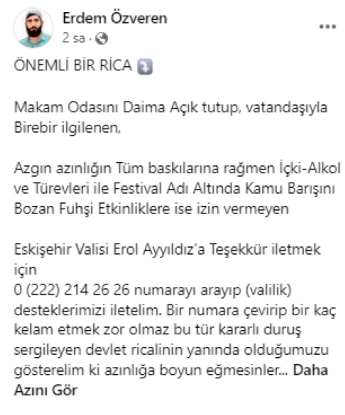 Özveren bununla da kalmayıp, takipçilerini Vali Ayyıldız'ı telefonla arayıp karar için "teşekkür" etmeye çağırdı. Ayyıldız'a övgüler düzen Özveren, "Makam odasını daima açık tutup, vatandaşıyla birebir ilgilenen, azgın azınlığın tüm baskılarına rağmen içki-alkol ve türevleri ile festival adı altında kamu barışını bozan fuhşi etkinliklere ise izin vermeyen Eskişehir Valisi Erol Ayyıldız'a teşekkür iletmek için 0 (222) 214 26 26 numarayı arayıp (valilik) desteklerimizi iletelim. Bir numara çevirip bir kaç kelam etmek zor olmaz bu tür kararlı duruş sergileyen devlet ricalinin yanında olduğumuzu gösterelim ki azınlığa boyun eğmesinler..." ifadelerini kullandı.