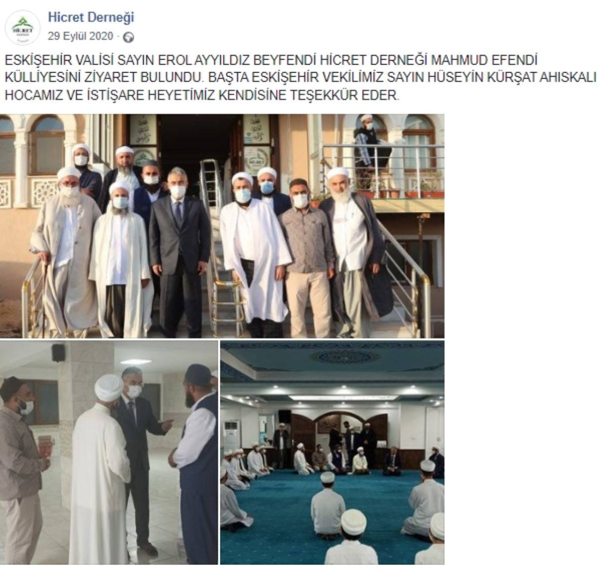Ziyarete ilişkin yapılan açıklamada, "Eskişehir Valisi Sayın Erol Ayyıldız Hicret Derneği Mahmut Efendi Külliyesi'ne ziyarette bulundu. Başta Eskişehir vekilimiz Sayın Hüseyin Kürşat Ahıskalı hocamız ve istişaret heyetimiz kendisine teşekkür eder" ifadeleri kullanılıyor.